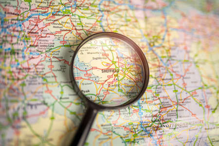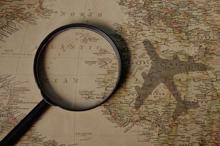 On the table under the magnifying glass are maps of the USA. Nearby is the pen and notebook. Travel preparation.