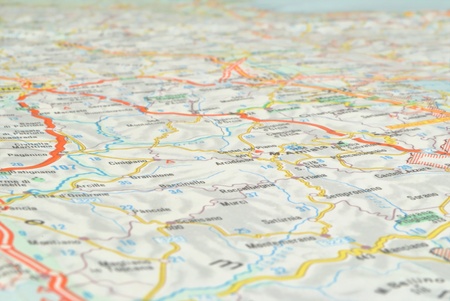 This captivating close-up photo showcases a vintage map displaying intricate routes and colorful markings, ideal for travel enthusiasts and map collectors.