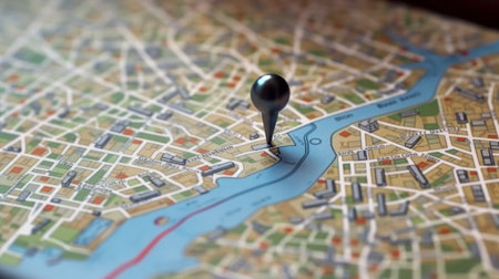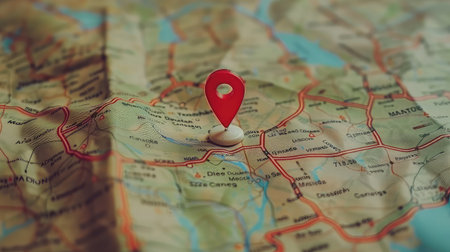 A close-up photo of a red location pin placed on a detailed map, with a soft, blurry background. The image has a minimalist and sleek aesthetic.