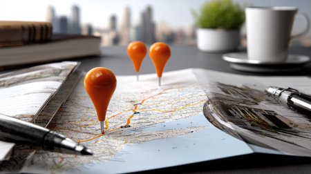 A creative flat lay featuring orange map pins on a detailed city map, accompanied by a coffee cup and notebooks, ideal for travel planning.