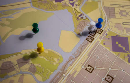 Find your way. Location marking with a pin on a map with routes. Adventure, discovery, navigation, communication, logistics, geography, transport and travel theme concept background. Map pin icons