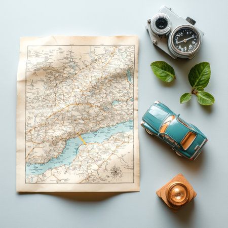 A green toy car placed alongside a vintage map, a retro camera, and leaves, symbolizing nostalgic travel planning. Space for text is available