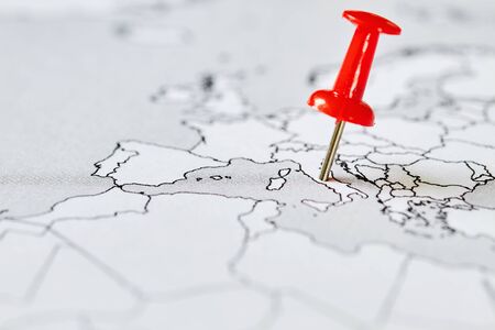 Map of Europe with red pushpin that marked Italy where is covid-19 epidemic. Concept of the spread of the virus. Closeup