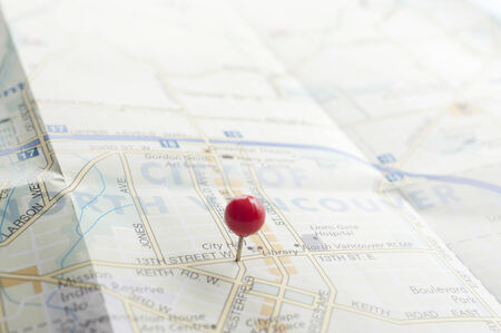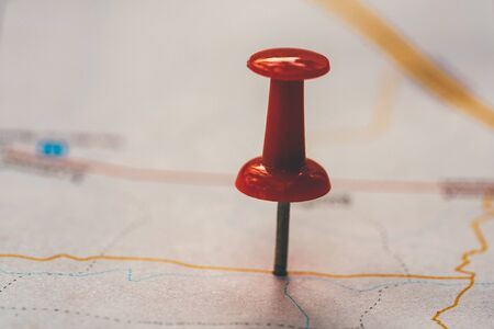 Red push pin on a blurry road map, symbol of travel planning, logistics and decisions