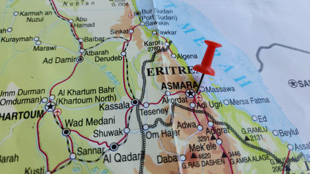 View of Asmara, or Asmera, is the capital and most populous city of Eritrea, in the country's Central Region, on a geographical map of Africa, marked with red push pin