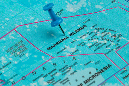 A map displaying the Marshall Islands shows various islands with a blue pushpin indicating a specific location. Clear details highlight geographical features and borders.