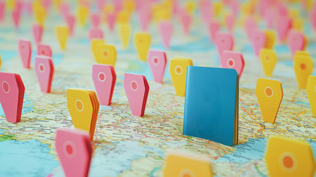 Brightly colored pins highlight diverse global spots on a detailed map, emphasizing European sites, capturing the essence of international travel plans and interconnected