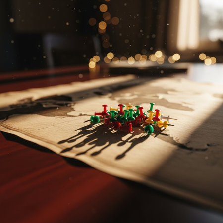 Brightly colored push pins are placed on a map, highlighting various locations. The setting suggests an activity focused on travel planning and exploration.. Details matter.