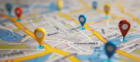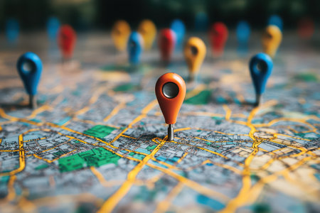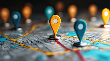 A detailed image of a map featuring colorful location pins that represent urban exploration and navigation, symbolizing travel, distance, and adventure opportunities.