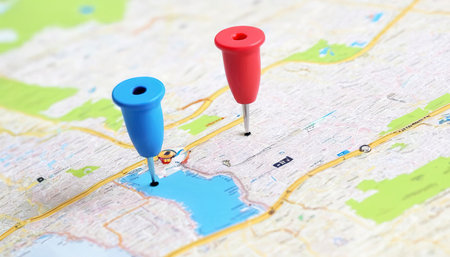 Detailed map showing a specific location marked with two vibrant pins, symbolizing starting and destination points in a GPS navigation system for efficient route planning.