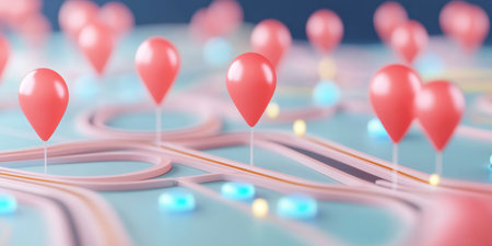 This vibrant image showcases colorful map markers on a 3D urban map, symbolizing various locations and enhancing navigation for modern city exploration and connectivity.