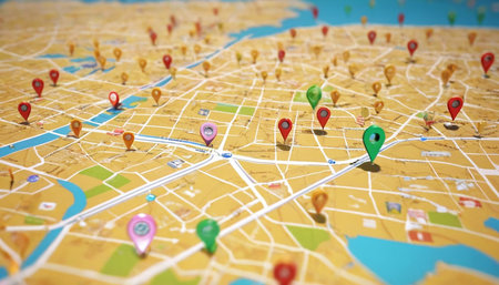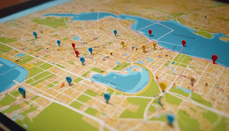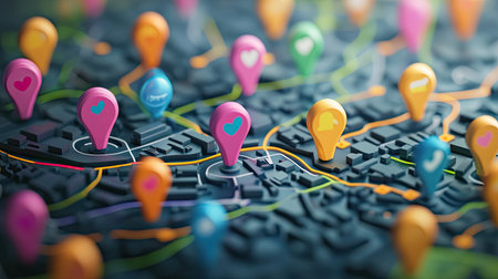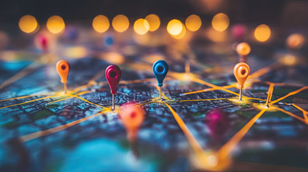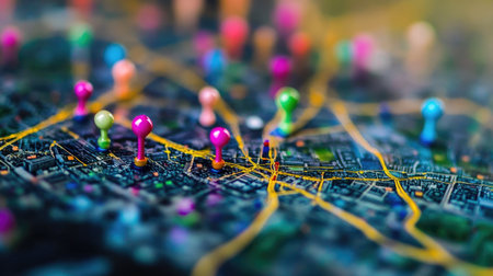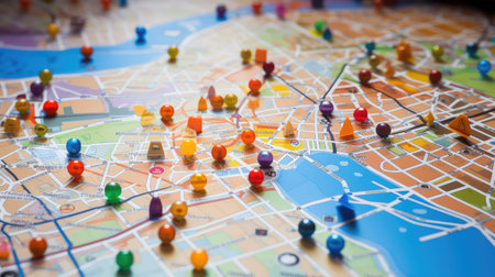Colorful map pins create vivid points of interest on a detailed city map, representing exploration, navigation, and travel planning across vibrant urban settings.