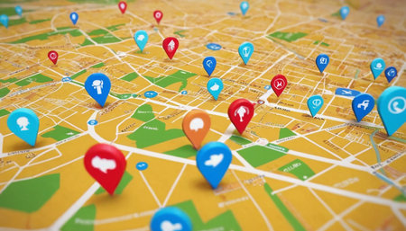 A close-up view of a stylized city map with numerous colorful map pins scattered across its surface. The map yellow streets and green park areas. The pins are in shades of blue, red, and orange, each displaying a white such as a person, a cloud, or a speech bubble. The perspective is angled, giving a sense of depth and highlighting the arrangement of the pins on the map.