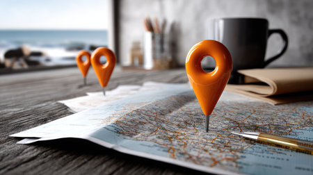 A close-up view of vibrant orange location pins set on a paper map, next to a steaming coffee cup and a notepad, capturing the essence of travel planning.