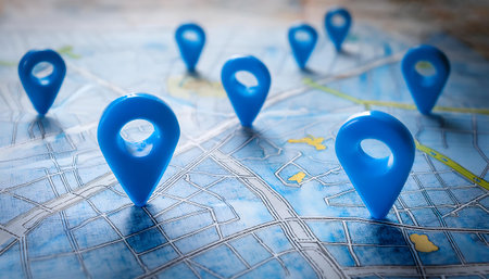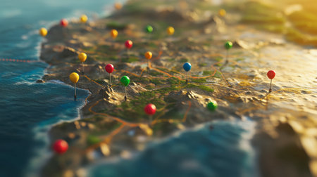 Colorful pins highlight specific locations on a coastal map. This visually engaging image captures the essence of exploration and planning, ideal for travel and navigation themes.