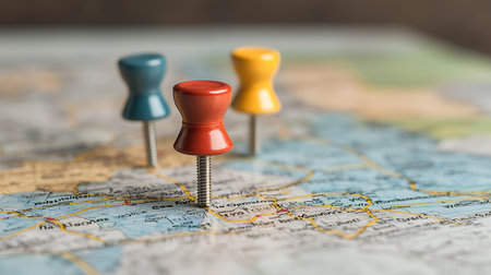 Close-up of colorful push pins on a map, symbolizing connections and navigation. Ideal for illustrating planning, exploration, and travel strategies in personal and business contexts.