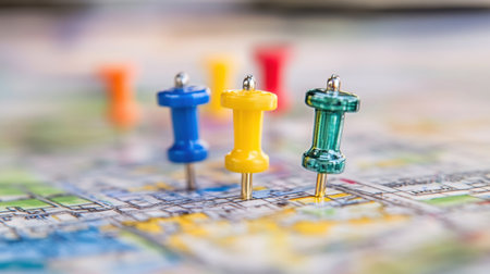 Colorful push pins strategically placed on a map, symbolizing travel planning, destinations, and exploration, perfect for guiding your next adventure.