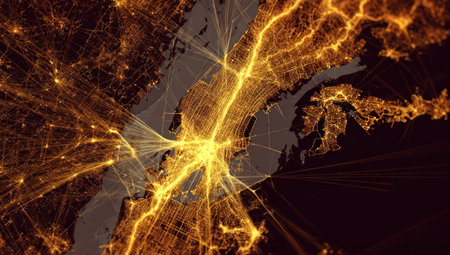 A luminous visualization of city lights and transportation networks across a coastal landscape