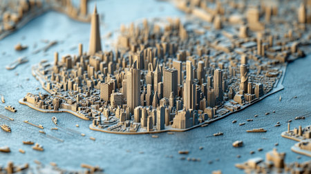 A stunning 3D model showcasing an intricate urban cityscape with detailed skyscrapers and surrounding water, capturing the essence of modern city life.