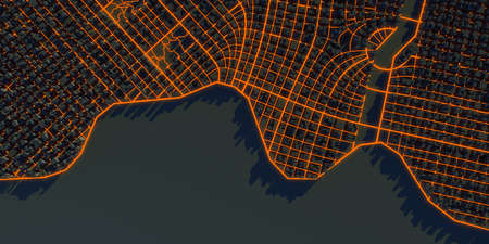 Abstract black, modern city architecture design urban background with orange glowing streets, digital city landscape buildings concept, flat lay top view from above,3D illustration