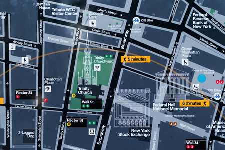 NEW YORK, USA - SEP 22, 2015: Map of the Lower Manhattan (Downtown). Downtown was originated at the southern tip of Manhattan Island in 1624