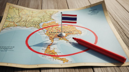 Thailand flag on the pushpin with red thread showed the paths of movement or areas of influence in the global economy on the wooden map. Planning of traveling or logistic concept. Network connection.