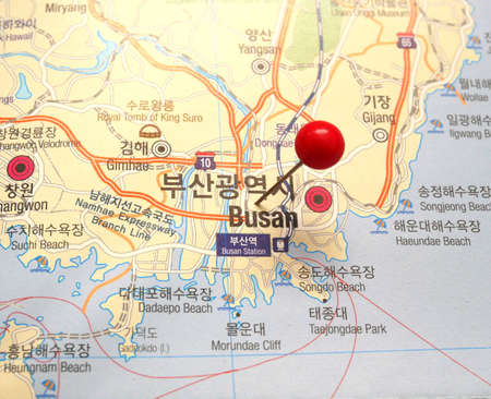 Red pin marked Busan on map, South Korea.