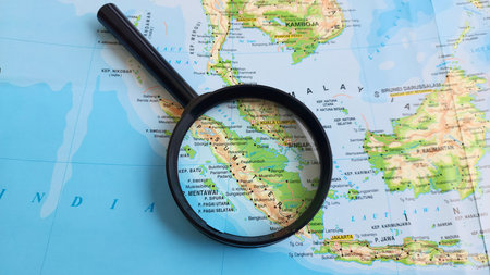 view of Sumatra, Sumatra is the sixth-largest island in the world and the largest in Indonesia, on a geographical map of Asia, seen using a magnifying glass