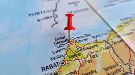 View of Tangier, City in and capital of Tanger-Tetouan-Al Hoceima, Morocco, on a geographical map of Africa, marked with red push pin