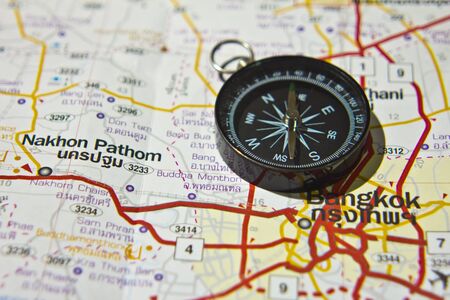 Tourist planning vacation use pen pointing on the map and other travel accessories around on the table. Vocation, travel, holidays and backpack concept.