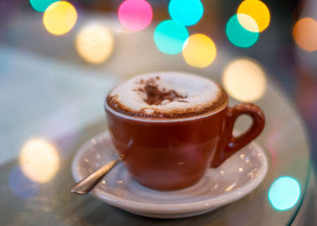 Brown cup of cappuccino on white Saucer with colorful bokeh balls with copy space, side view