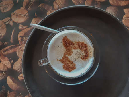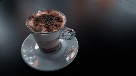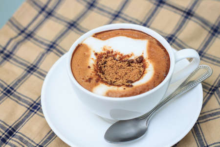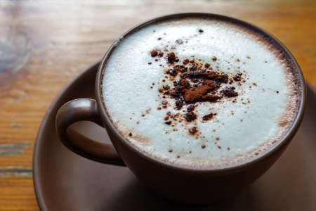 The hot cappuccino cup, decorated with milk foam and sprinkled with coffee powder, gives a very pleasant feeling to drink with copy space