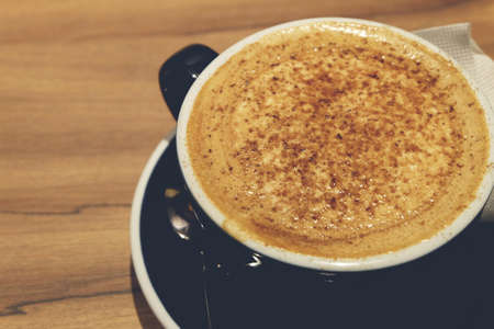 Closeup Hot cappucino coffee in black cup, vintage tone