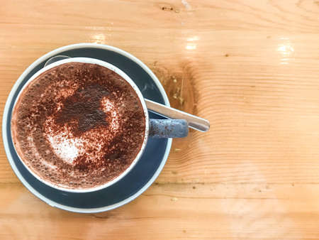 cup of hot chocolate on a wooden table top. top view.
