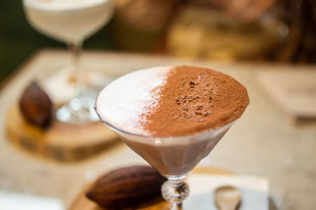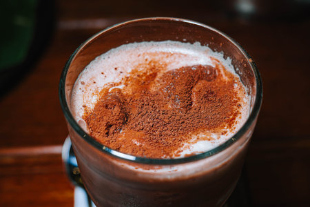 Top view shot of milk with Chocolate or Cocoa Powder on the top in a glass with bokeh background