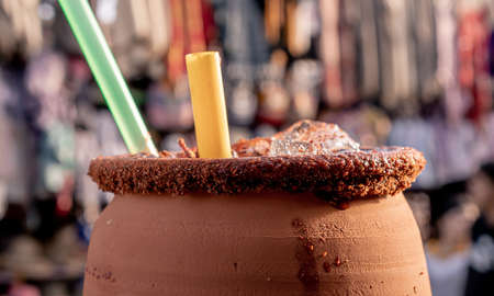 Delicious traditional Mexican clay jugs from Jalisco with lemon soda, tequila, tamarind and ice with a straw on top.