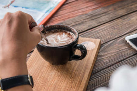 Chocolate coffee with chocolate powder on a cup