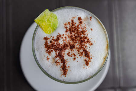Peruvian, Mexican, Chilean traditional drink pisco sour liqueur, with fresh lime, on rusty black table, copy space top view