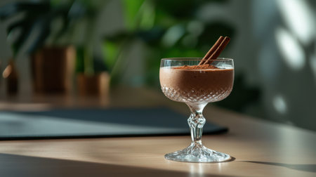 A glass of chocolate drink with cinnamon sticks in it. The drink is in a small glass and is sitting on a table