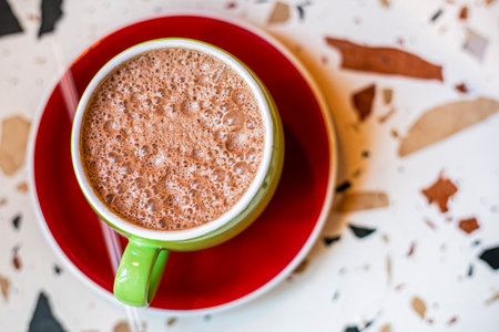 Hot cocoa with frothed milk in ceramic cup