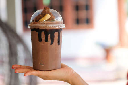 Iced cocoa. Sweet and refreshing. A cup in hand in a modern coffee shop. sweet cup on hand, hold coffe cup