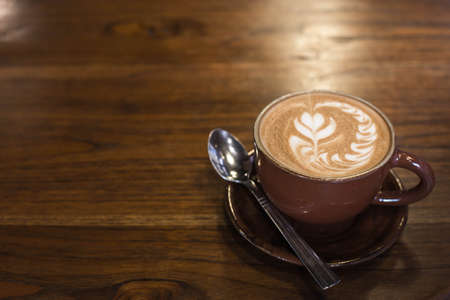 Hot art Latte Coffee in a cup on wooden table and Coffee shop blur background with bokeh image.