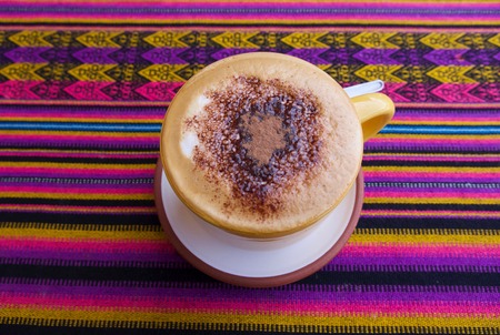Hot Cappuccino top with cinnamon powder on peruvian fabric background