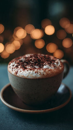 Cappuccino with whipped cream and cocoa powder in a cup on a background of blurred lights
