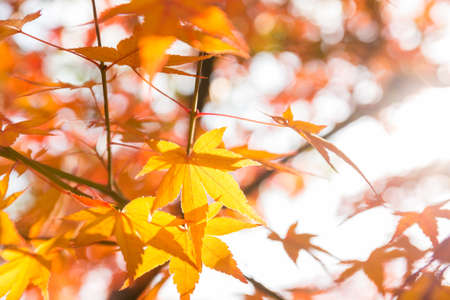 Beautiful maple leaves in autumn sunny day in foreground and blurry background in Kyushu, Japan. No people, close up, copy space, macro shot.