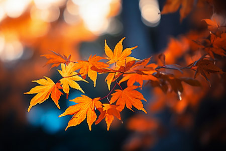 Bright orange and yellow leaves hang from a delicate branch capturing the essence of autumn in a peaceful forest. The warm light enhances the beauty of the changing foliage.