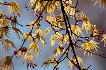 The view of the young red leaves of Japanese maple (Acer palmatum) in Spring. Japan