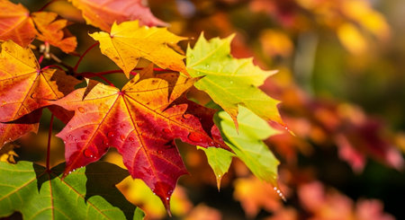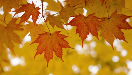 In autumn, maple leaves in various shades of yellow, red, and orange fall gracefully, transforming the landscape with their seasonal colors