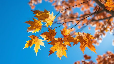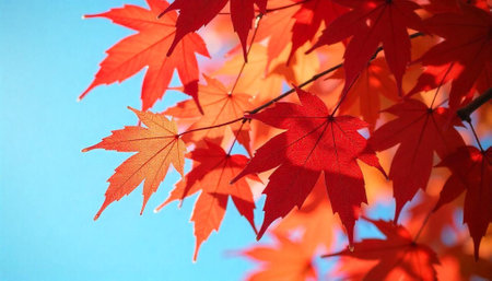 View of autumn foliage, featuring vibrant shades of orange, red, and yellow maple leaves against a clear blue sky, illuminated by bright sunlight.