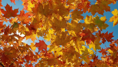 Generative AI : Beautiful colorful orange yellow and red autumn foliage of maple trees in a sunny day on the nature of looking up against blue sky